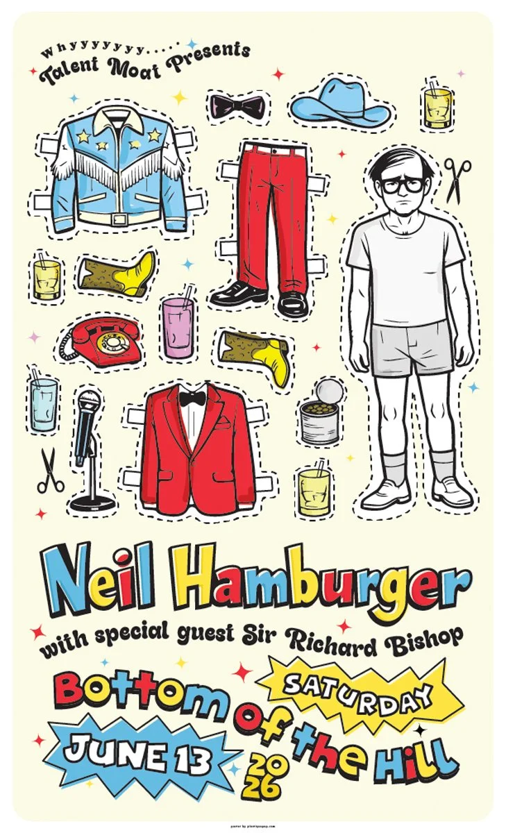 “America’s Funnyman” Neil Hamburger has worked every imaginable stage, from New York’s Madison Square Garden, to a show in pitch black darkness at the Edinburgh Fringe Fest. He has performed countless American, Australian, British, Irish, and Canadian tours, as well as in Norway, New Zealand, and the Bahamas, along-side acts ranging from Faith No More to Robin Williams. His TV credits include* Tim and Eric Awesome Show*, Tom Green Live, and Jimmy Kimmel Live. His Live At Third Man album was produced by Jack White in Nashville; an earlier Hamburger effort was included in SPIN’s “40 Greatest Comedy Albums Of All Time.” The feature movie Entertainment, a dramatic look at Hamburger on- and off-stage co-star-ring John C. Reilly, Tye Sheridan, and Michael Cera, premiered at the Sundance and Locarno Film Festivals, and was released in 2015 to rave reviews. His recent Drag City album of lavishly-produced song, Still Dwelling, featured a memorable trio version of Jesus Christ Superstar's "Everything's Alright" with Neil singing alongside Mike Patton and Jack Black.